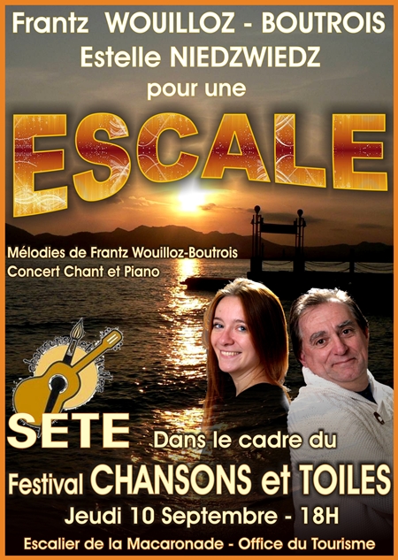 « Escale » vous invite à un voyage hors du temps, si ce n’est celui de vous poser pour une parenthèse de rêve. Estelle NIEDZWIEDZ, professeur aux écoles de musique Grand Orb et Sète, sera au clavier et Frantz WOUILLOZ-BOUTROIS Ténor interprétera les airs de ce spectacle en vous contant quelques histoires.