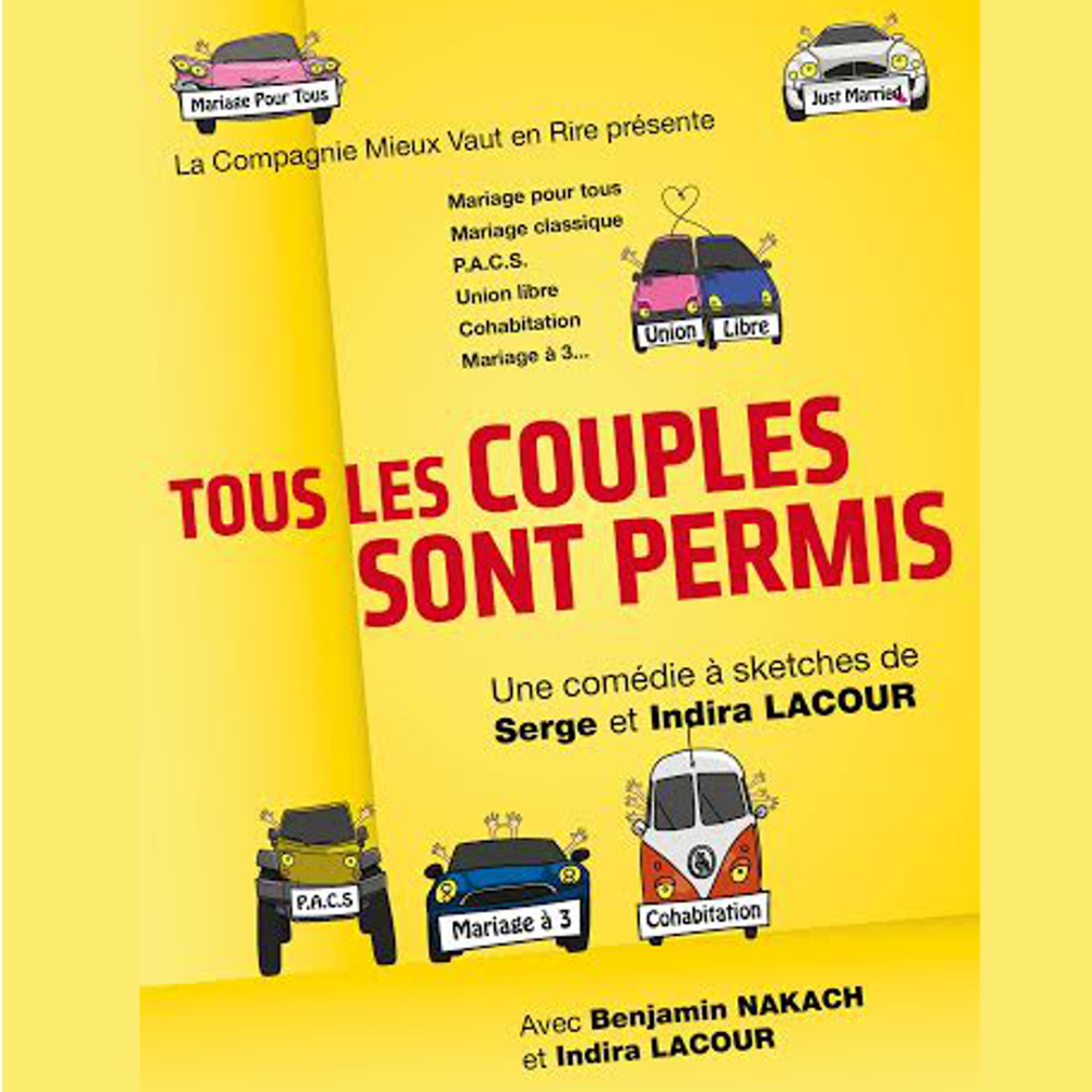Cette comédie à sketches fait vraiment l’inventaire de toutes les formules pour vous mettre en couple en 2020 ! Devez vous aller voir ce spectacle ? Cochez les cases qui vous correspondent ! On démarre par une timide cohabitation, qu’on transforme, tacitement, en union libre. On continue, sans se mouiller de trop, avec un P.A.C.S. On poursuit, quelquefois, avec un mariage pour tous ou classique selon le cas. Et on finit par une séparation, un divorce ou, pour les plus discrets, par un mariage à 3 (voire à 4). Réponses : Si vous avez coché 1 case, vous vous êtes trompé de spectacle, nous ne pouvons rien pour vous. 2 cases : Vous avez beaucoup souffert et il est urgent de vous débarrasser de tout ce que vous avez sur le coeur en venant rire de tout cela avec nous. 3 cases : Vous êtes condamnés, outre les pensions que vous devez verser tous les mois, à venir à 3 minimum et à plein tarif. Une bonne thérapie doit couter cher ! 4 cases et plus : Vous allez vous éclater !