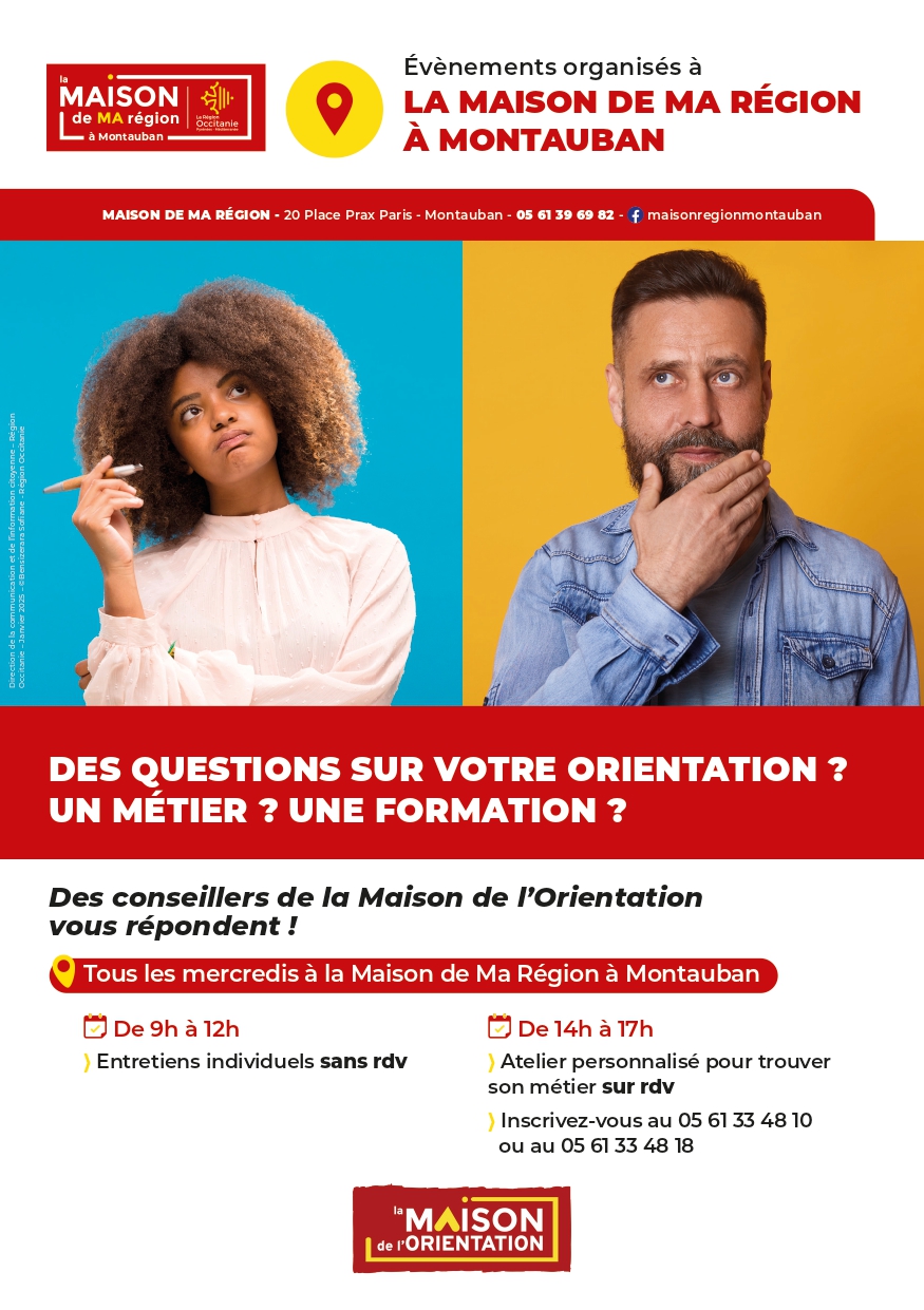 Les permanences de la Maison de l’Orientation de Toulouse ont lieu tous les mercredis à la Maison de Ma Région à Montauban au 20 place Prax Paris, 82000 Montauban.