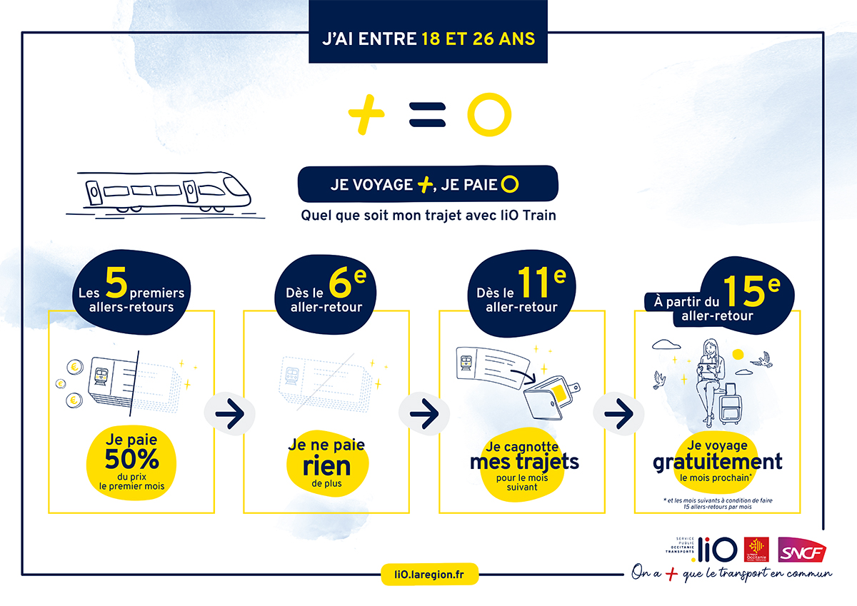 En s’adressant aux jeunes, la Région veut modifier les habitudes de mobilité. Après les billets estivaux à 1€, puis le tarif à 50% sans carte LibertiO’ depuis octobre, la Région lance pour les grands voyageurs de 18 à 26 ans la formule « + = 0 ». Le principe est simple, sans engagement : plus le jeune voyage en train liO, plus il obtient de crédits sur son compte mobilité (associé à une application mobile). Il paie 50% des 5 premiers allers-retours mensuels et voyage gratuitement les 5 suivants. Du 11e au 15e aller-retour, il crédite son compte mobilité et à partir du 15e, voyage gratuitement le mois suivant. Avant une généralisation prévue en octobre, une expérimentation débutera au 1er avril auprès de 2 000 jeunes volontaires, tirés au sort après une mini-enquête de mobilité. Les candidatures seront ouvertes en mars sur le site web www.ter.sncf.com/occitanie.