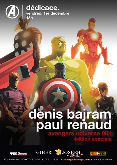 En warm-up de l’édition du Toulouse Game Show 2017, nous avons le grand plaisir de vous annoncer une séance de dédicaces à ne pas rater autour de la parution d’une version collector de la nouvelle revue Panini "Avengers Universe #1", avec une couverture réalisée en exclusivité pour Gibert Joseph par Denis Bajram et dont une partie de l’histoire est, heureux hasard, dessinée par Paul Renaud, le vendredi 1er décembre à partir de 15h00 au rayon Comics de notre magasin Gibert Joseph Musique.