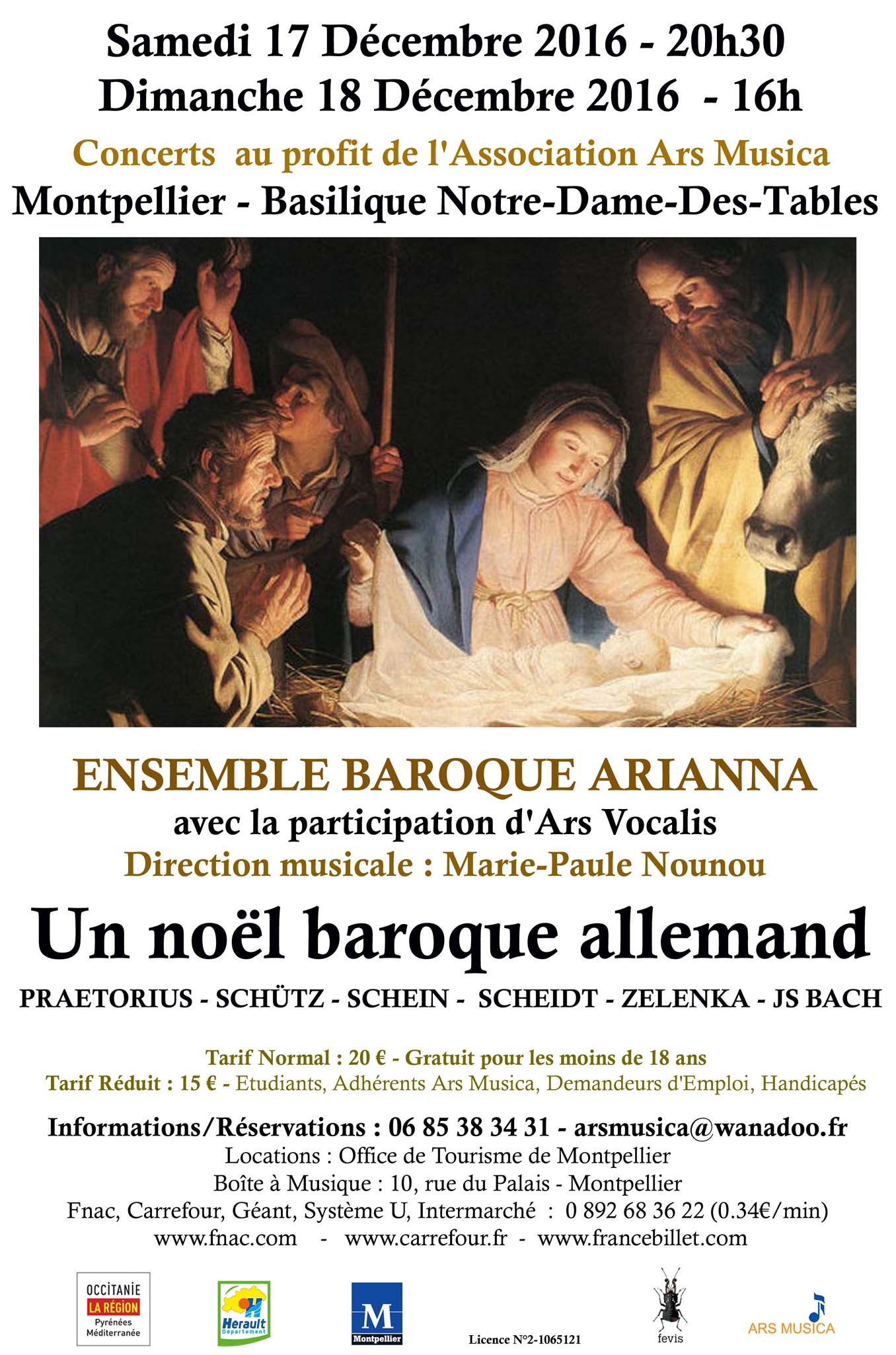 C’est dans la belle Basilique Notre-Dame-Des-Tables de Montpellier, que l’Ensemble Arianna sous la direction de Marie-Paule Nounou, proposera ce noël baroque allemand, avec la participation des choristes d’Ars Vocalis, pôle d’art vocal de l’Ensemble Arianna, et des solistes Lucile Magnan, Médéric Martin, Christophe Hecquet, Alix Bergeault, Pierre-Henri Colombier et Pascal Friggeri. Venez fêter avec nous le temps de Noël et soutenir l’association Ars Musica qui a besoin de vous pour rendre accessible à tous l’art de la musique ancienne et baroque. Venez nous aider et passer un très bon moment musical.