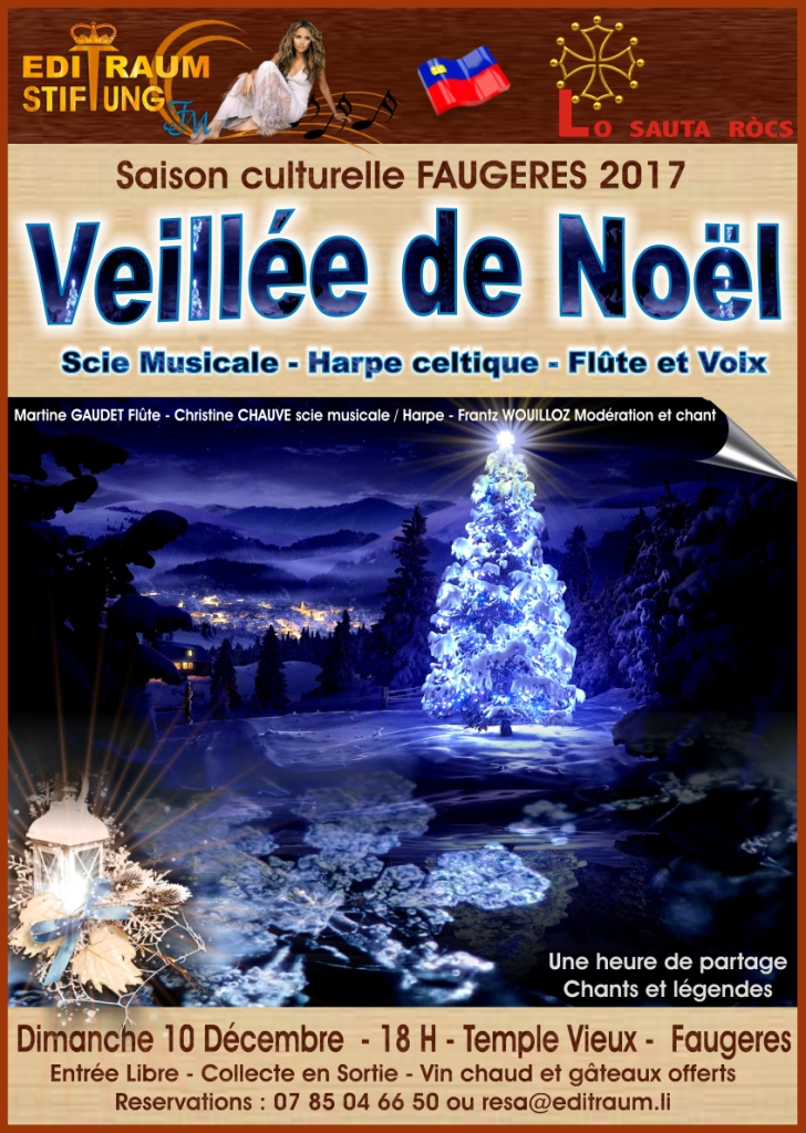 Contes et légendes autour du vin chaud et des petits gâteaux au son d’une flûte et d’une scie musicale et… pleins de surprises. Terminons l’année dans le partage et la joie de Noël, comme autrefois a la veillée au coin du feu. Le son captivant de la scie musicale jouée avec une virtuosité incomparable par la concertiste Christine Chauve, nous entrainera sur les sentiers enneigés d’une forêt. Une forêt perdue au milieu de nul par, éclairée par la seule lueur des étoiles et des bougies de celles et ceux qui se retrouvent au cœur de la nuit pour célébrer le temps de l’Avent afin de bien préparer cette fête de Noël chère au cœur de tous les enfants que nous avons su rester. Les accents de la harpe celtique nous transporteront vers des mélodies venues d’ailleurs mais qui célèbrent à leur façon Noël et nous mettent en communion avec d’autres cultures pour mieux nous enrichir. Les traits d’une flûte traversière nous amèneront à chanter tous ensemble pour clôturer ce moment de partage avec vin chaud et petits gâteaux. Pensez à prendre des vêtements chauds et un petit coussin pour votre confort. – Christine CHAUVE : Scie musicale et Harpe celtique – Martine GAUDET Flûte traversière – Frantz WOUILLOZ-BOUTROIS Contes Légendes et Chant.