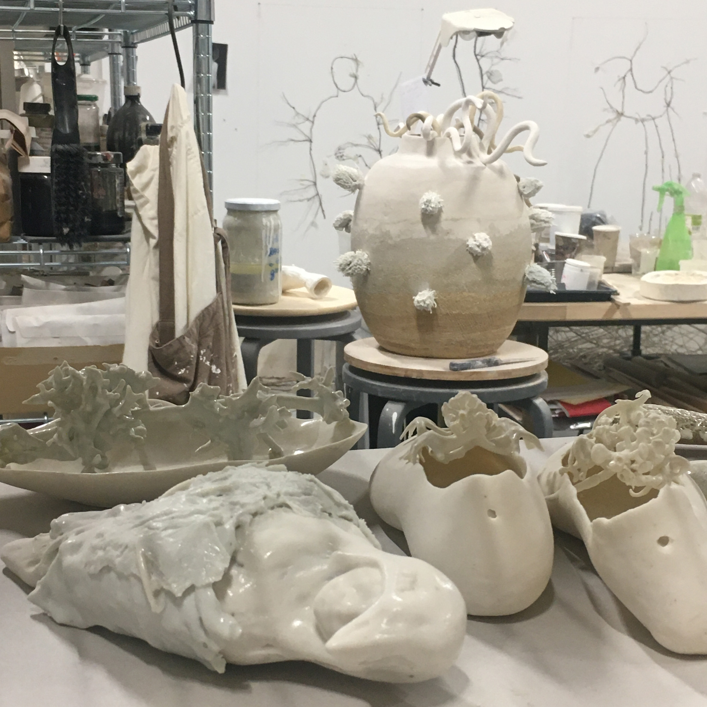 L’atelier est organisé en fonction de mes différentes pratiques en plusieurs espaces dédiés au moulage, au modelage, à la cuisson des pièces céramiques, au dessin au mur ou dans l’espace et au travail du métal ( laiton) et soudure à l’argent .