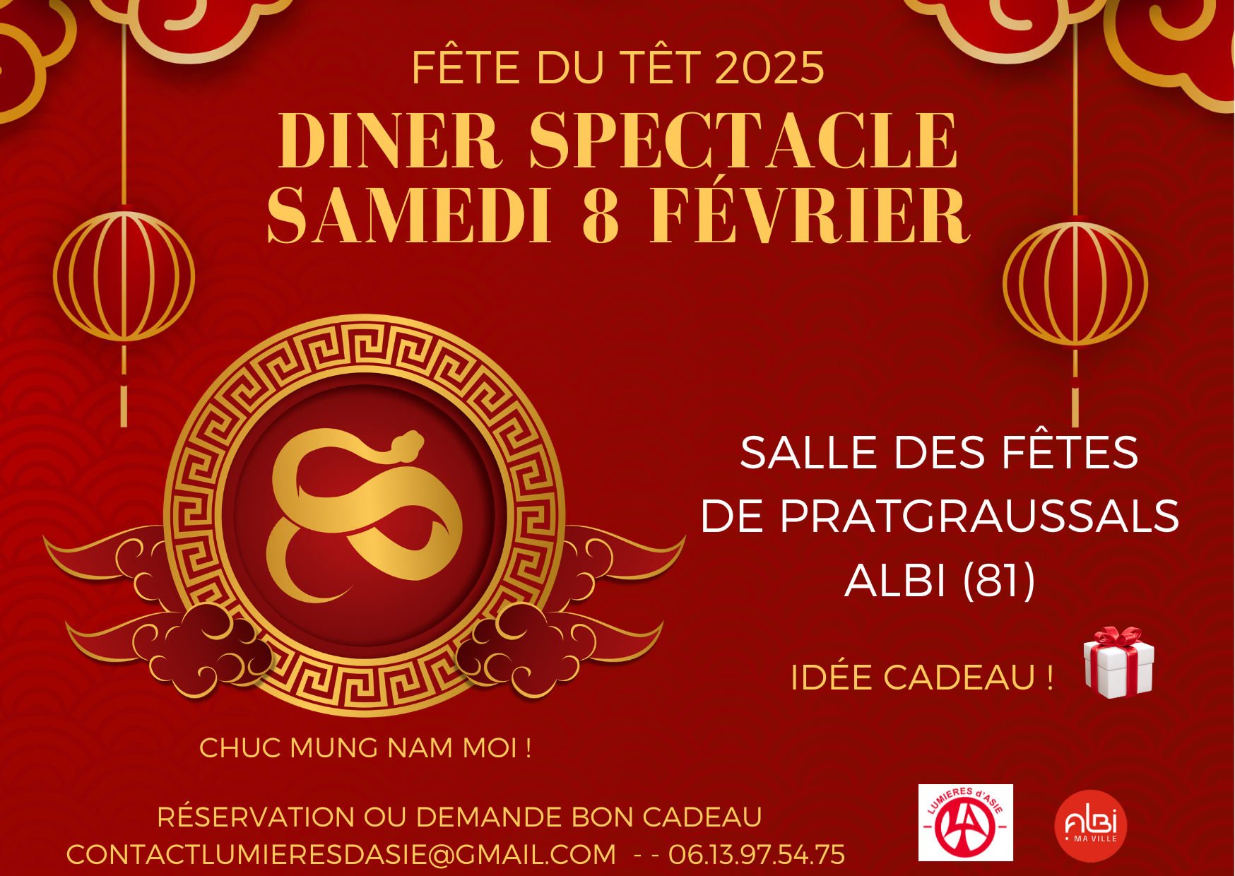Infos pratiques : L’association LUMIÈRES D’ASIE propose son rendez-vous annuel le 8 Février 2025 à l’occasion de la fête du nouvel an Vietnamien, le Têt, sous le signe du serpent cette année.