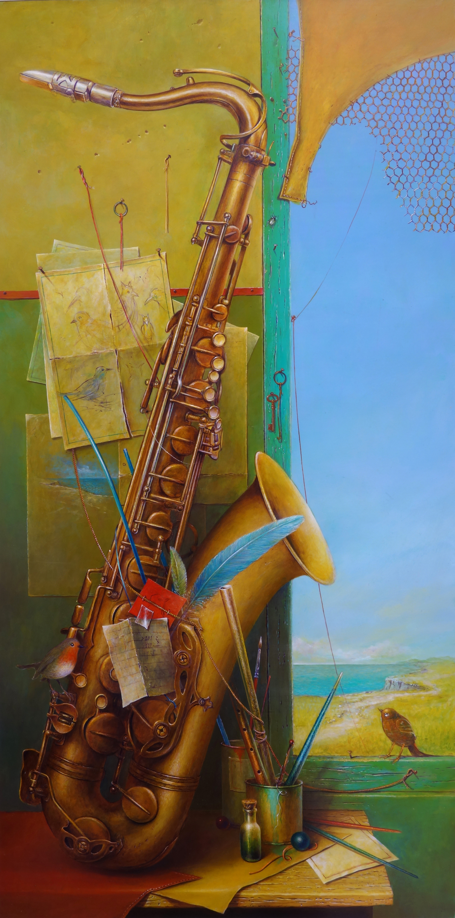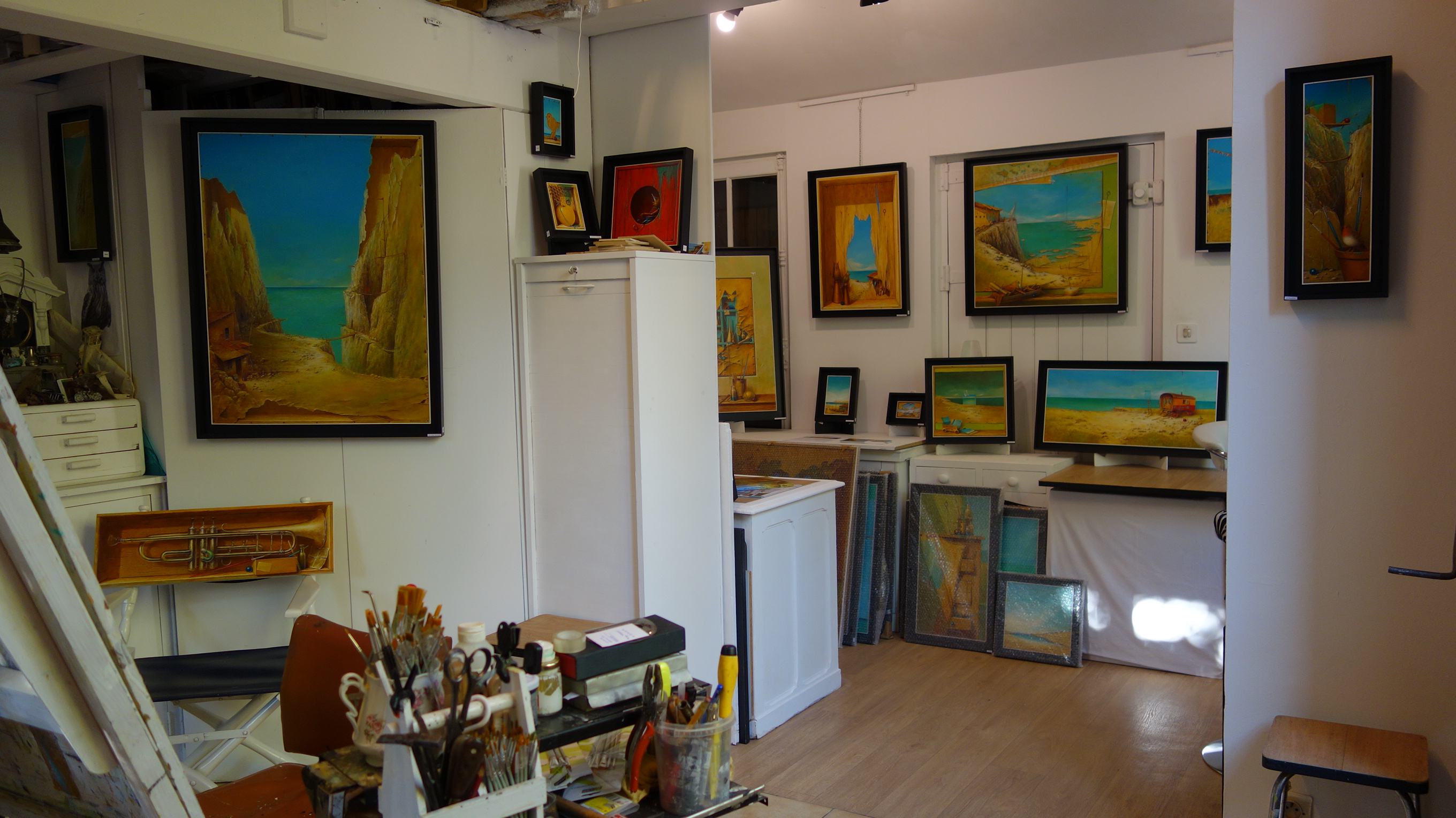 Au fil du temps le champ visuel va s’élargir, la dimension s’ouvrira sur la fenêtre, le paysage ; la lumière devenant un des principes, une des caractéristiques de l’écriture. La terre se confronte à l’océan ; grillages, bateaux, flacons et cartonnages divers, ainsi que le pantin Victor, émaillent le propos. La géométrie de la composition joue des lignes de fuites, la numérologie, l’anagramme, le canular qui sont des forces directrices dans l’œuvre, des éléments qui entraînent le regard, le pousse à la découverte de chemins induites par des cartes qui telles des portulans, stimulent l’aventure, suscite le rêve dans un parcours codé. Pour chaque œuvre, le choix du format est prépondérant, allant de la miniature au polyptyque.