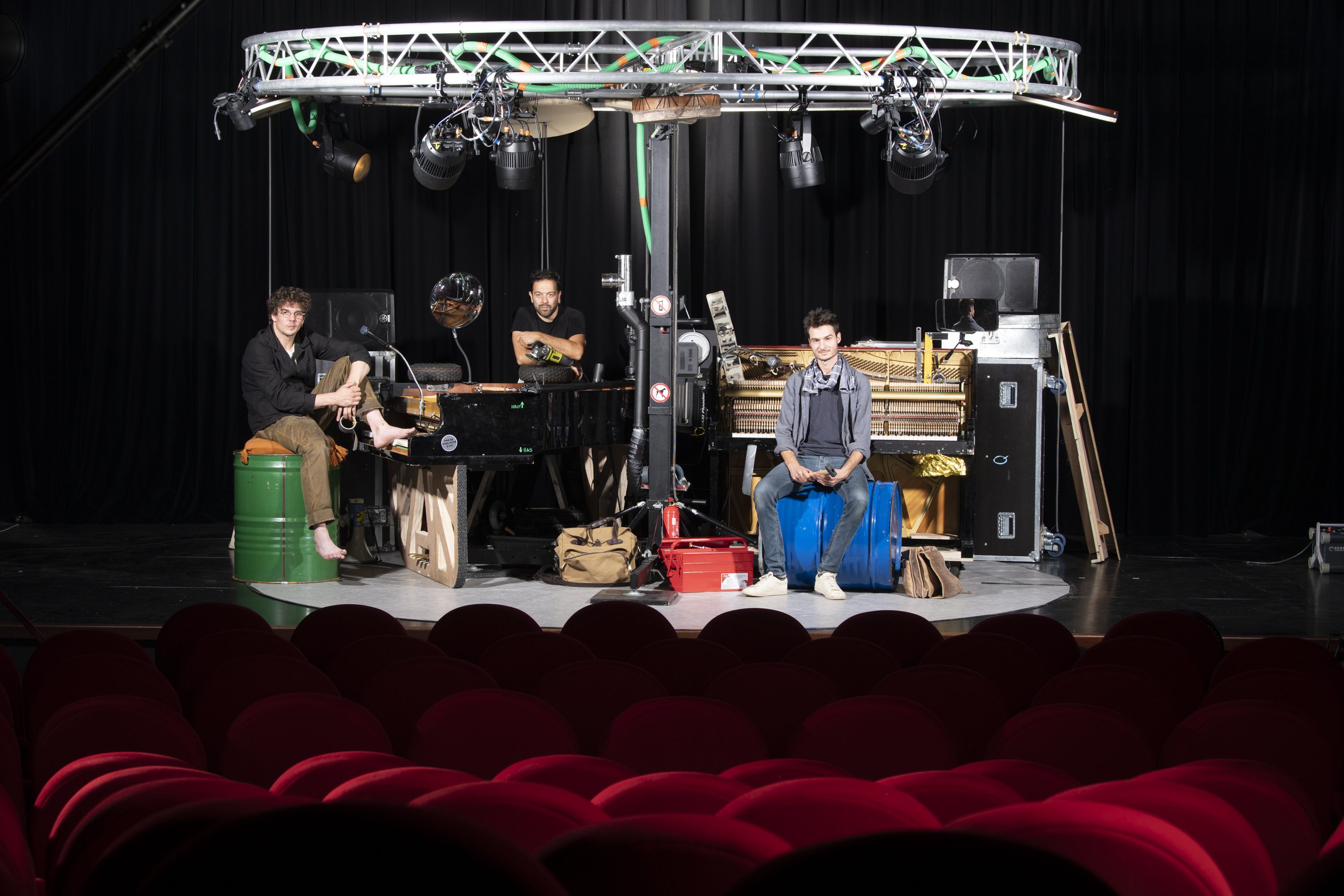 Spectacle en totale autonomie technique. Son, lumières et pianos sont apportés par les artistes et constituent le décor du spectacle.
