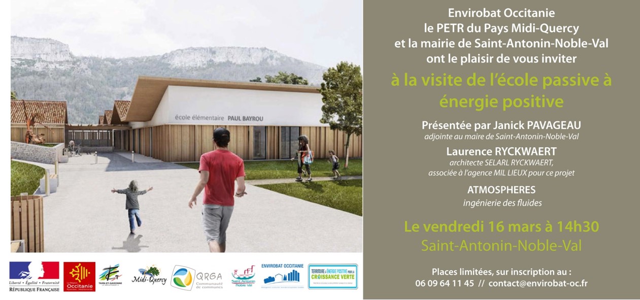 Envirobat Occitanie, en partenariat avec le PETR du Pays Midi-Quercy et la mairie de Saint-Antonin-Noble-Val, vous invite à une visite du chantier de l’école passive et à énergie positive de Saint-Antonin-Noble-Val, vendredi 16 mars 2018 à 14h30.