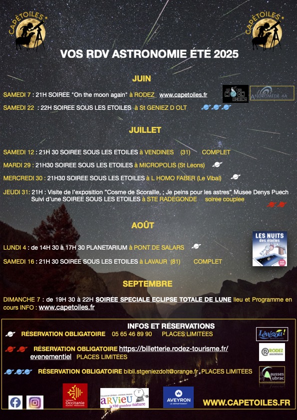 Retrouvez notre programme des soirées, visites, planétarium… sur le site www.capetoiles.fr et réservez vos activités auprès de nos partenaires (contacts en bas de l’affiche).