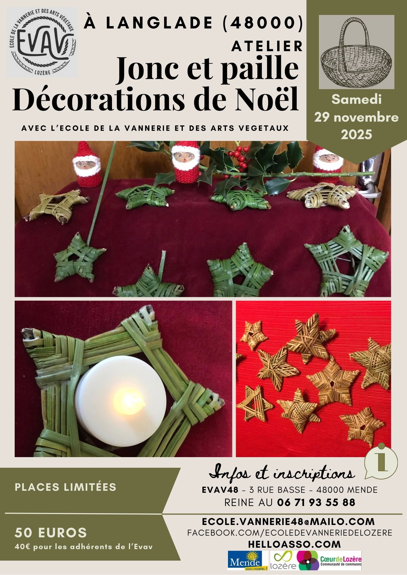 En prévision des fêtes de Noël, Reine vous proposera un atelier sur une journée qui vous permettra de créer 4 ou 5 sujets différents… de quoi décorer vos maisons ou même fabriquer vous-mêmes des cadeaux à offrir pour Noël ! Ça se passera à Langlade le 29 novembre 2025. Pour plus d’infos, appelez Reine au 06 71 93 55 88