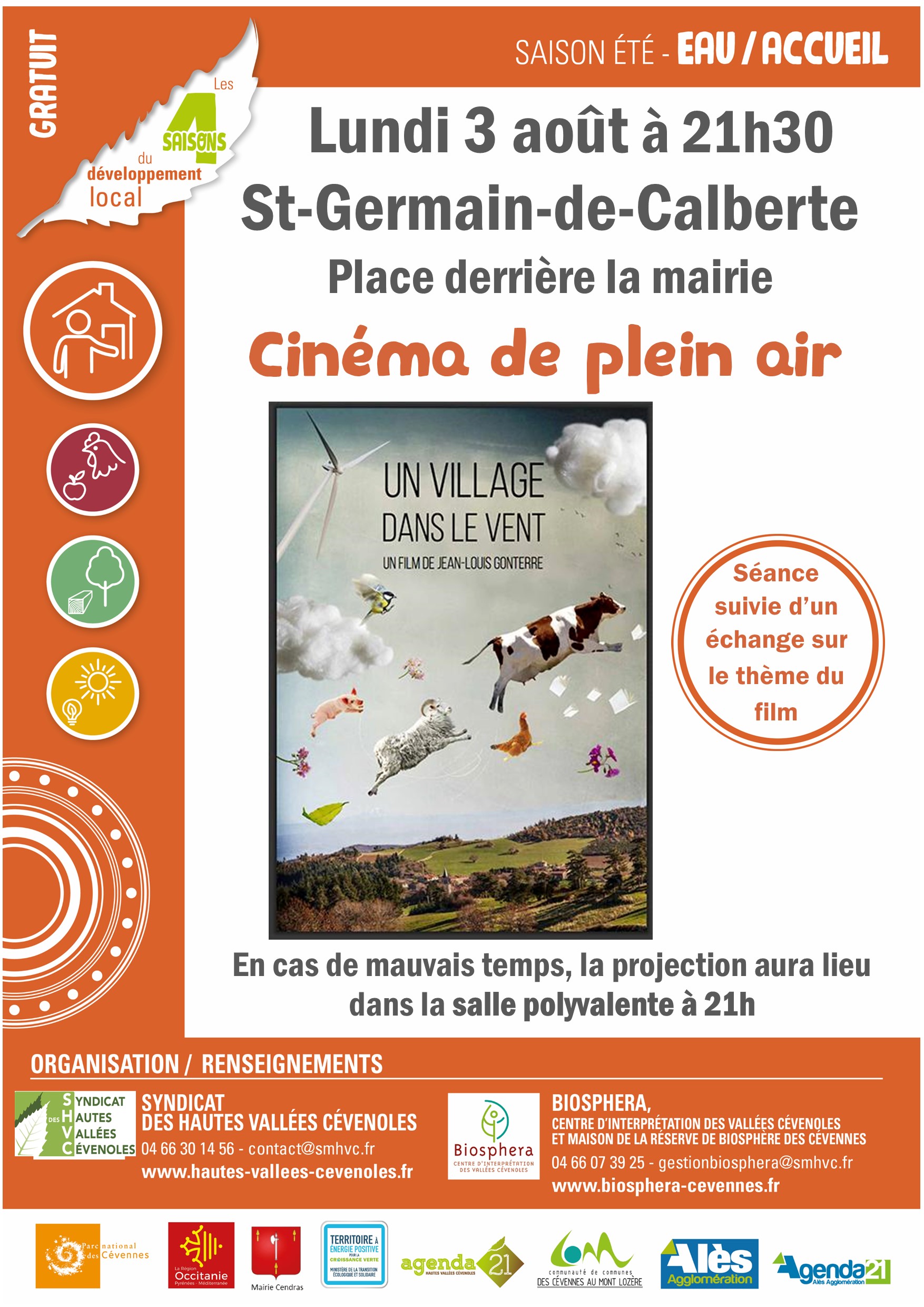 En cas de mauvais temps, projection dans la salle polyvalente du village à partir de 21h.