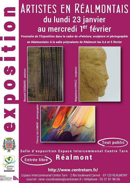 Comme chaque année, les trois artistes invités d’honneur de l’exposition éphémère « Peinture, sculpture et photographie en Réalmontais » organisée le premier week-end de février par la commission culture de la Mairie de Réalmont, sont mis à l’honneur par la Communauté de Communes Centre Tarn, dans le cadre de la programmation culturelle du Réseau Intercommunal des MEdiathèques.
