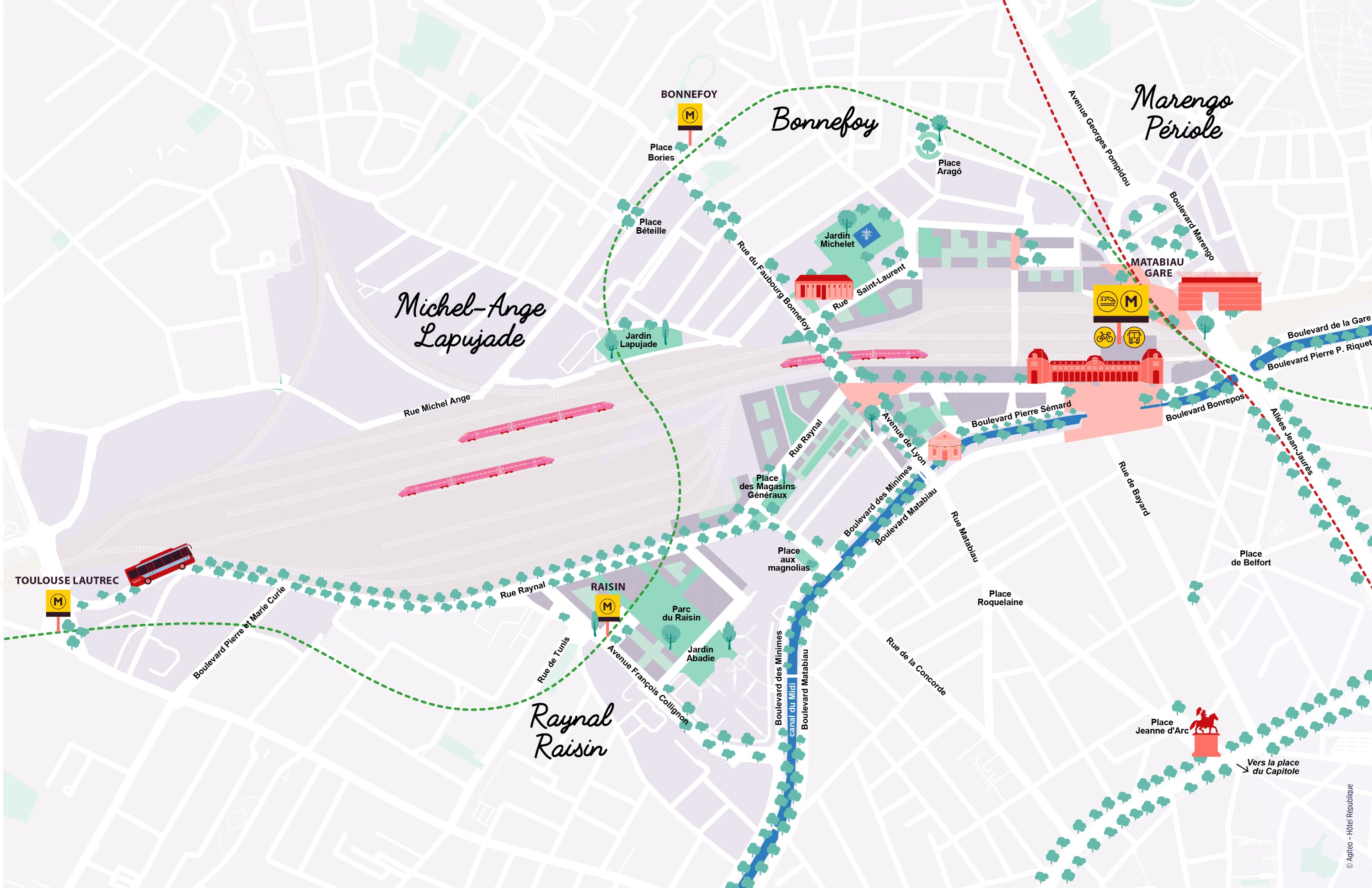 - Une Vélostation de 1 000 places en souterrain dans un espace fermé et sécurisé, financée par Toulouse Métropole. Des services en utilisation autonome ou des prestations de réparation seront proposés aux usagers. Un espace dédié d’information et de services vélos y sera implanté.