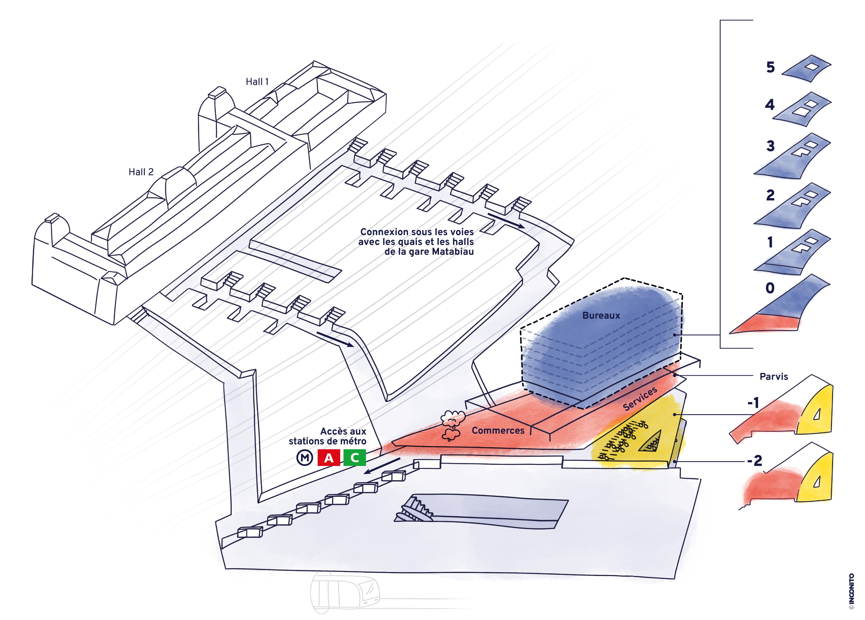 Financée par la Région Occitanie, la Halle des mobilités de 4 400 m2 déployée sur plusieurs niveaux, doit connecter, à horizon 2028, la gare historique Matabiau, les deux stations de métro A et C, la station de bus Marengo, les espaces publics en surface ainsi que les ouvrages de stationnement du secteur. Elle accueille également des services et des commerces destinés aux voyageurs et aux riverains.
