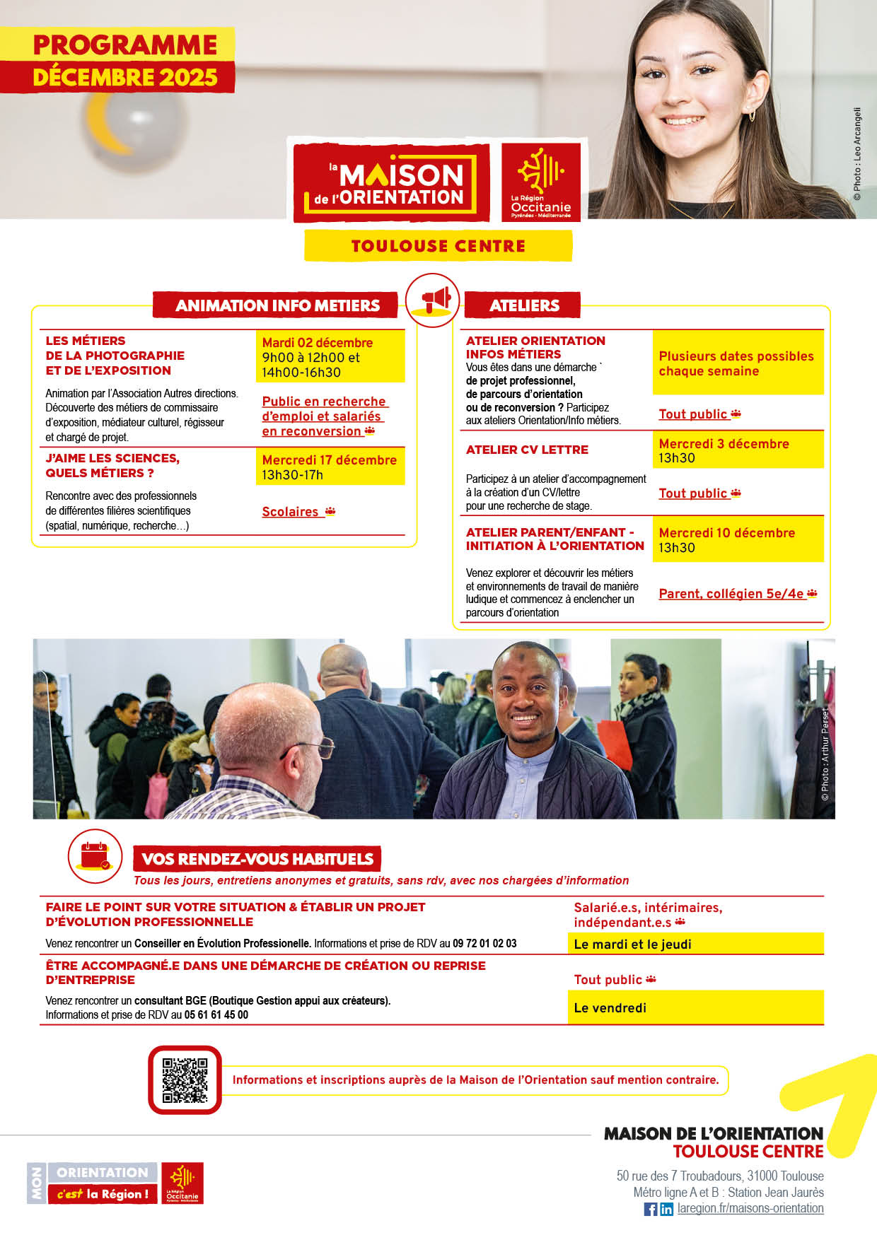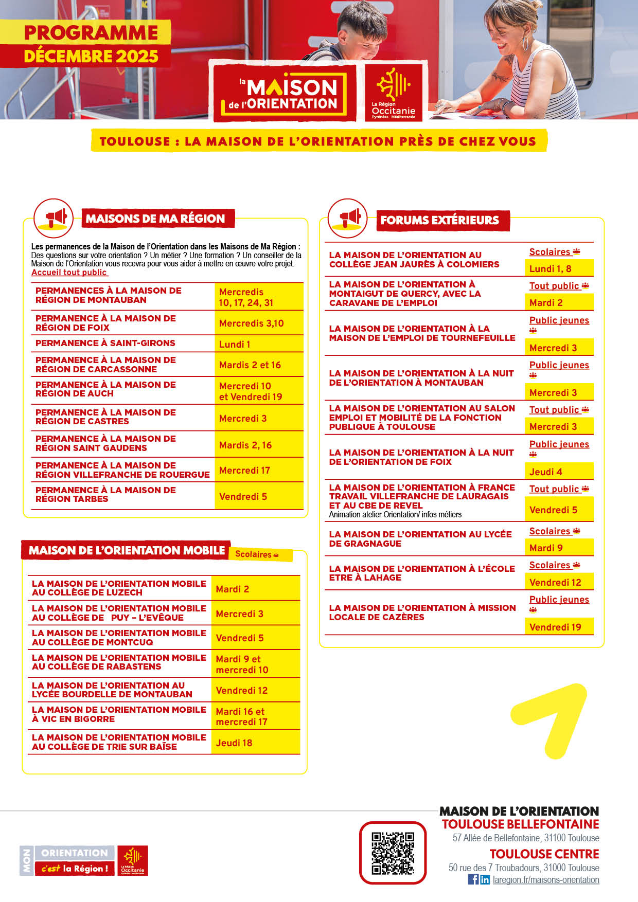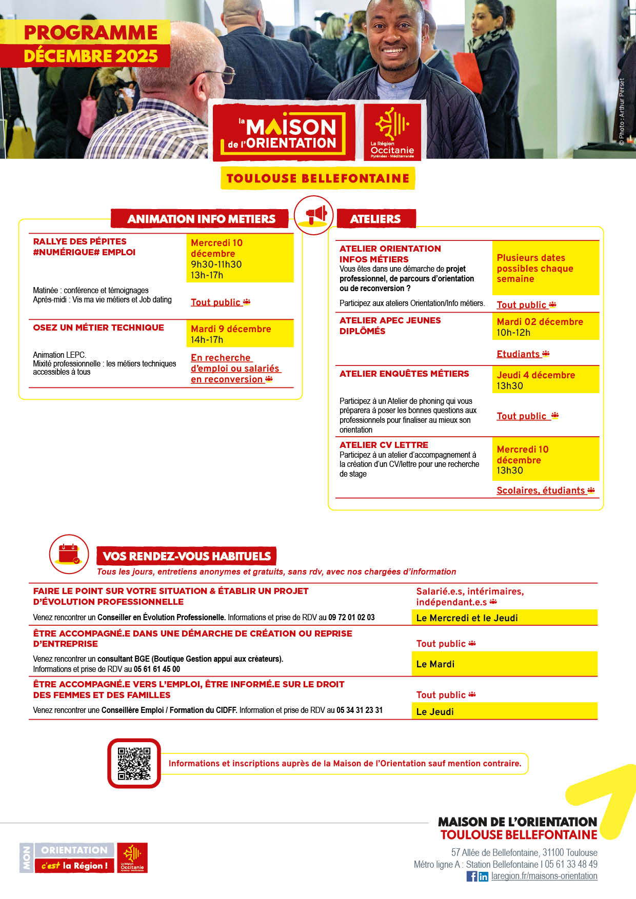 Le programme des animations, ateliers et rendez-vous de votre Maison de l’Orientation de Toulouse - Bellefontaine pour le mois de décembre est disponible.