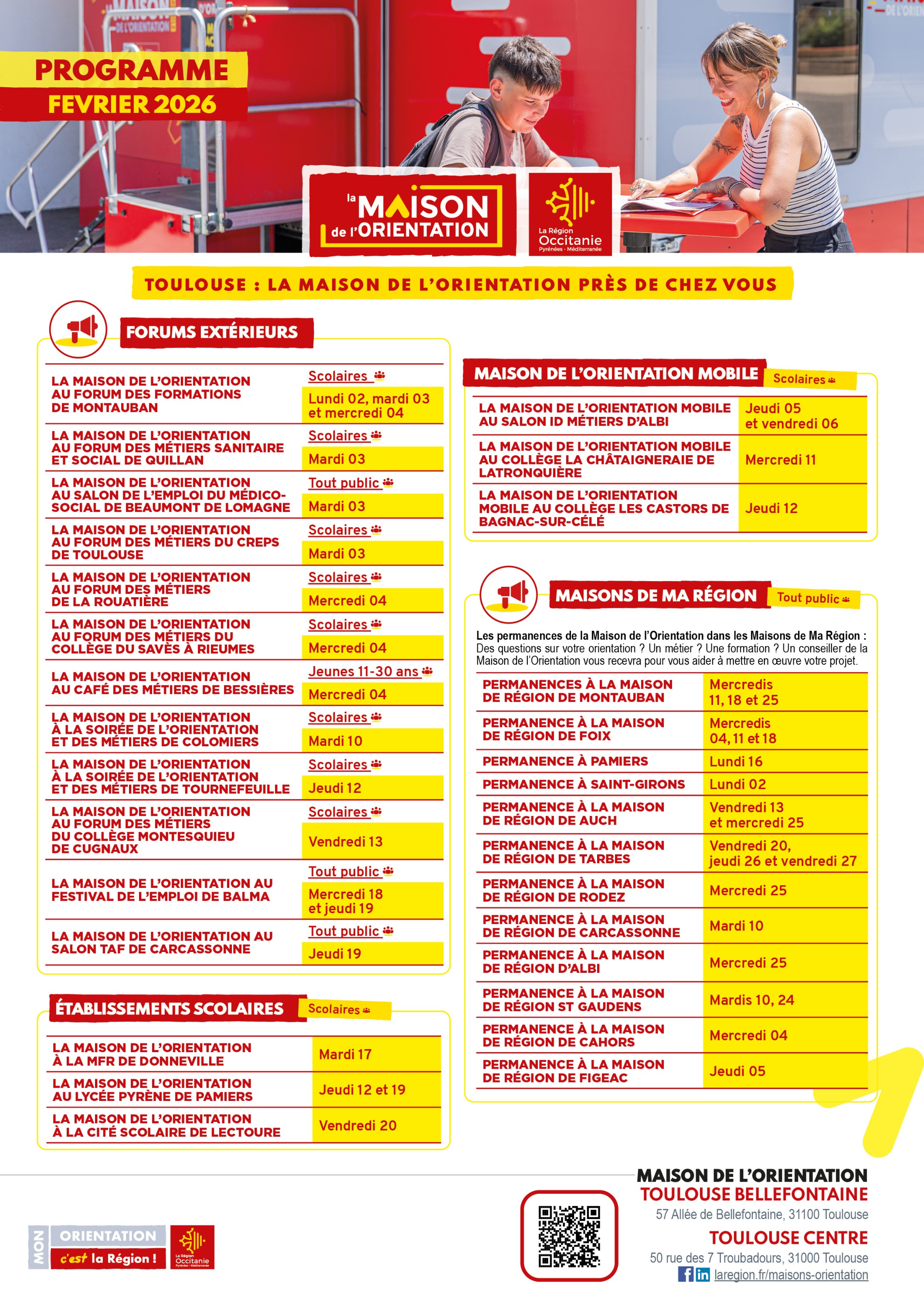 Le programme des animations, ateliers et rendez-vous des permanences dans les maisons de région, sur les forums et les établissements scolaires pour le mois de février est également disponible.