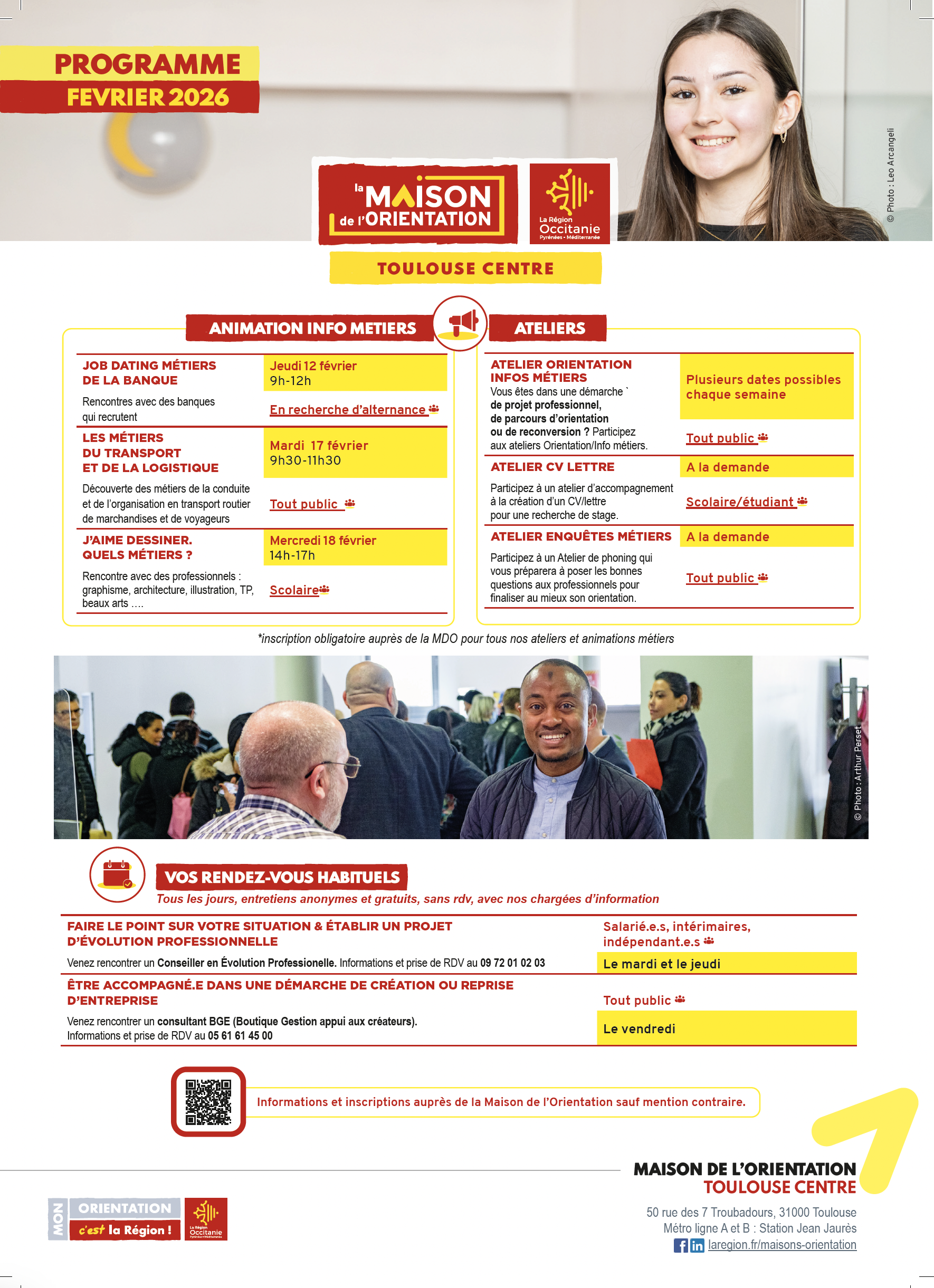 Le programme des animations, ateliers et rendez-vous de votre Maison de l’Orientation de Toulouse - Centre pour le mois de février est disponible.