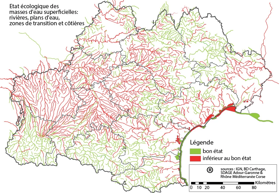Plus de la moitié des masses d’eau de surface (cours d’eau, plans d’eau, eaux côtières et eaux de transition) de l’Occitanie n’ont pas atteint le bon état visé par la Directive Cadre sur l’Eau, particulièrement du fait :