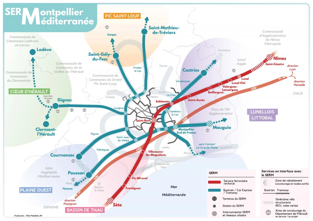 Cette situation a de lourdes conséquences en matière de pollution et de qualité de vie. Aussi, pour que chacun puisse facilement se déplacer et proposer une alternative efficace à la voiture individuelle, il est urgent de proposer un « mix de mobilités » performant. C’est pourquoi, dans une démarche partenariale inédite, la Région, le Département de l’Hérault, Montpellier Méditerranée Métropole, Nîmes Métropole, la Communauté de communes du Clermontais, la Communauté de communes du Grand Pic Saint-Loup, la Communauté de communes Lodévois et Larzac, Lunel Agglomération, Pays de l’Or agglomération, Sète Agglopôle, la Communauté de Communes Vallée de l’Hérault et Hérault Transport se mobilisent afin de porter la candidature pour la création du « Service express régional métropolitain (SERM) Montpellier Méditerranée ».