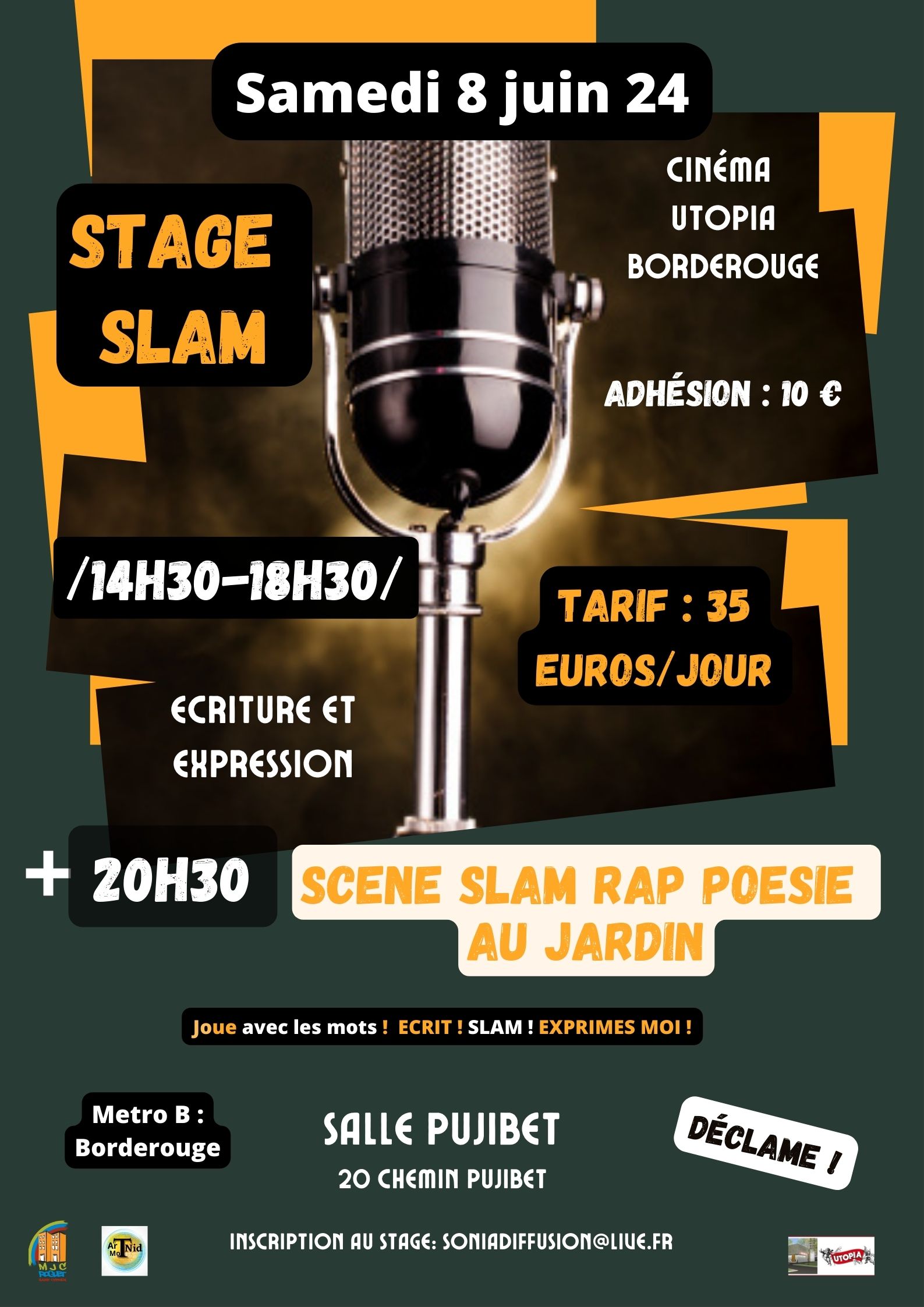 Infos pratiques : Stage écriture slam et poésie payant. Inscription par mail :soniadiffusion@live.fr