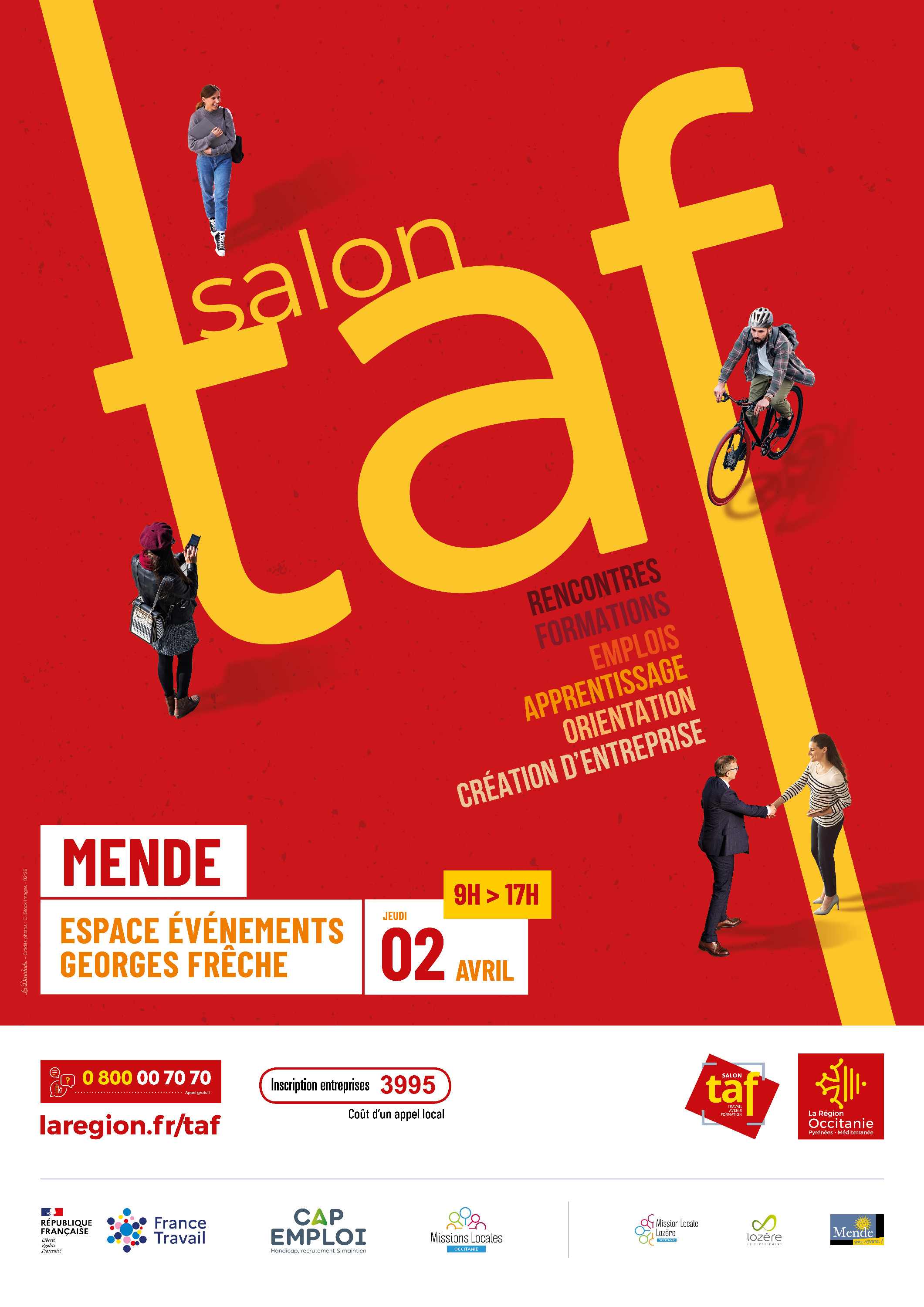 Le salon TAF de Mende aura lieu le 2 avril 2026 de 9 heures à 17 heures à l’Espace Evénement Georges Frêche. Il est organisé par la Région, en lien étroit avec France Travail et la Mission Locale Lozère, en collaboration des partenaires du territoire.